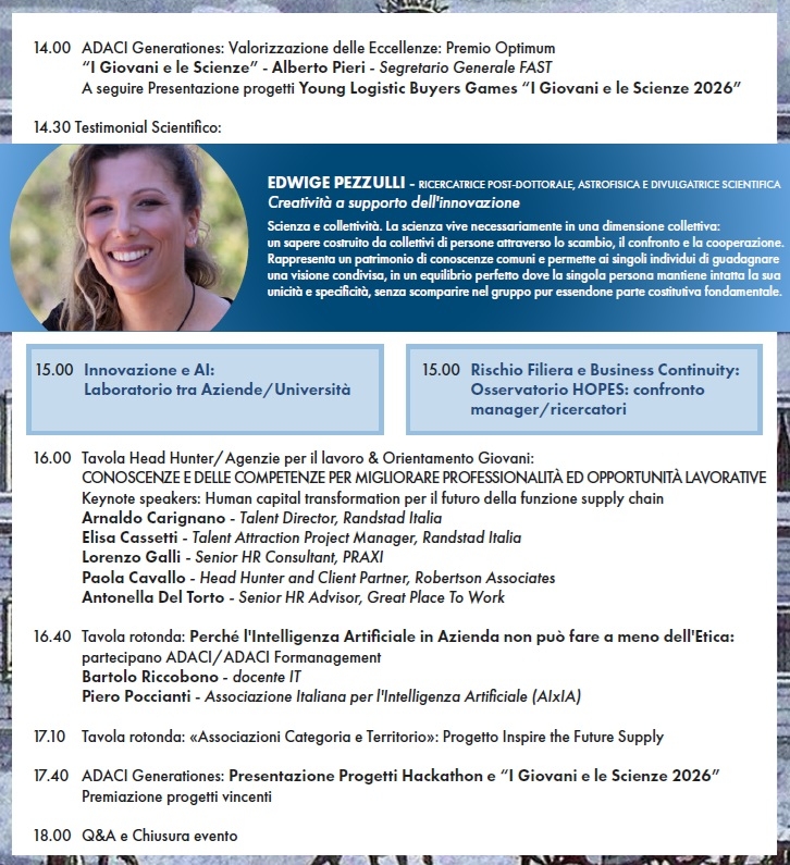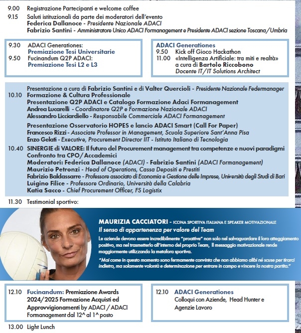 Partecipano all’evento testimonial ispirazionali di primo livello del mondo scientifico (Edwige Pezzulli) e sportivo (Maurizia Cacciatori) per utilizzare metodi ed approcci diversi per migliorare le performance manageriali.
